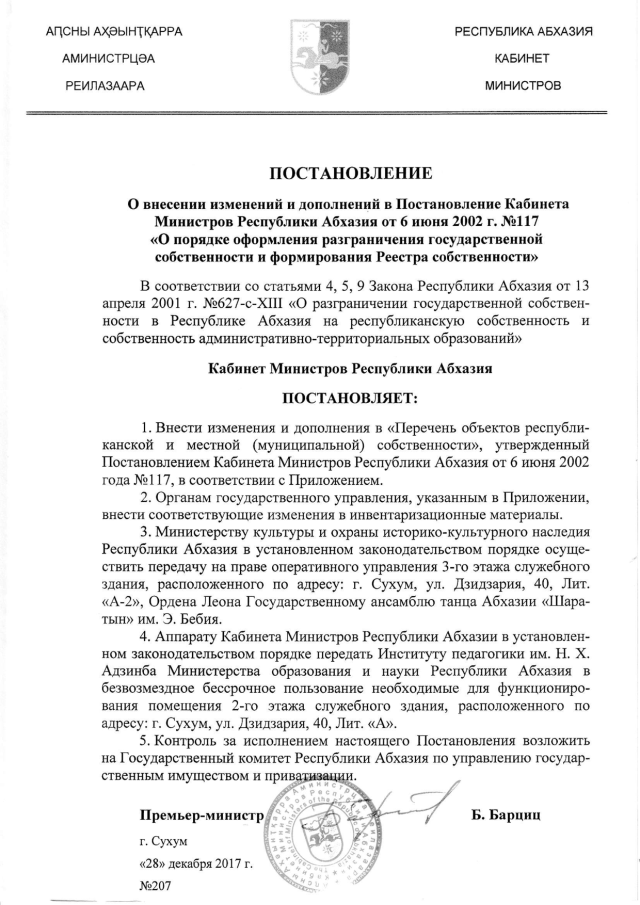 Постановление Кабинета Министров Республики Абхазия от 28.12.2017 № 207 "О внесении изменений и дополнений в Постановление Кабинета Министров Республики Абхазия от 6 июня 2002 г. № 117 "О порядке оформления разграничения государственной собственности и формирования Реестра собственности"