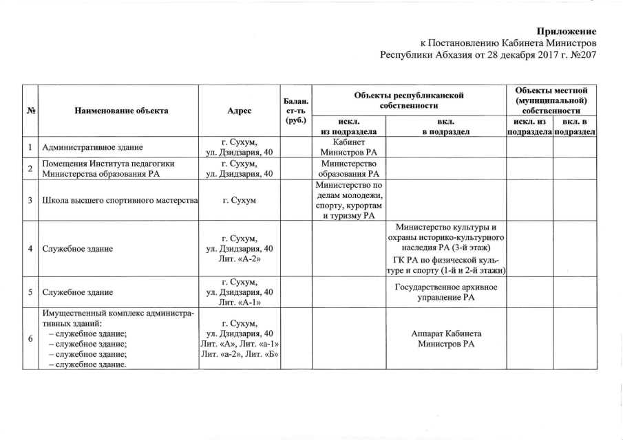 Постановление Кабинета Министров Республики Абхазия от 28.12.2017 № 207 "О внесении изменений и дополнений в Постановление Кабинета Министров Республики Абхазия от 6 июня 2002 г. № 117 "О порядке оформления разграничения государственной собственности и формирования Реестра собственности"