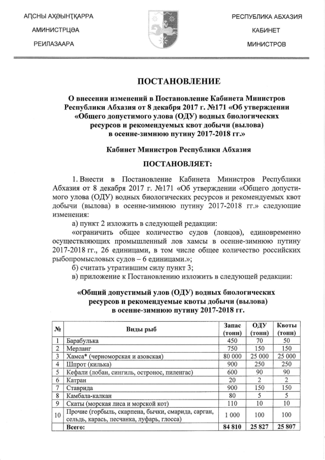 Постановление Кабинета Министров Республики Абхазия от 29.12.2017 № 208 "О внесении изменений в Постановление Кабинета Министров Республики Абхазия от 8 декабря 2017 г. № 171 "Об утверждении "Общего допустимого улова (ОДУ) водных биологических ресурсов и рекомендуемых квот добычи (вылова) в осенне-зимнюю путину 2017-2018 гг."