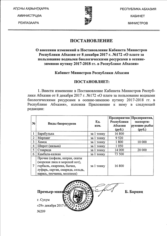 Постановление Кабинета Министров Республики Абхазия от 29.12.2017 № 209 "О внесении изменений в Постановление Кабинета Министров Республики Абхазия от 8 декабря 2017 г. № 172 "О плате за пользование водными биологическими ресурсами в осенне-зимнюю путину 2017-2018 гг. в Республике Абхазия"