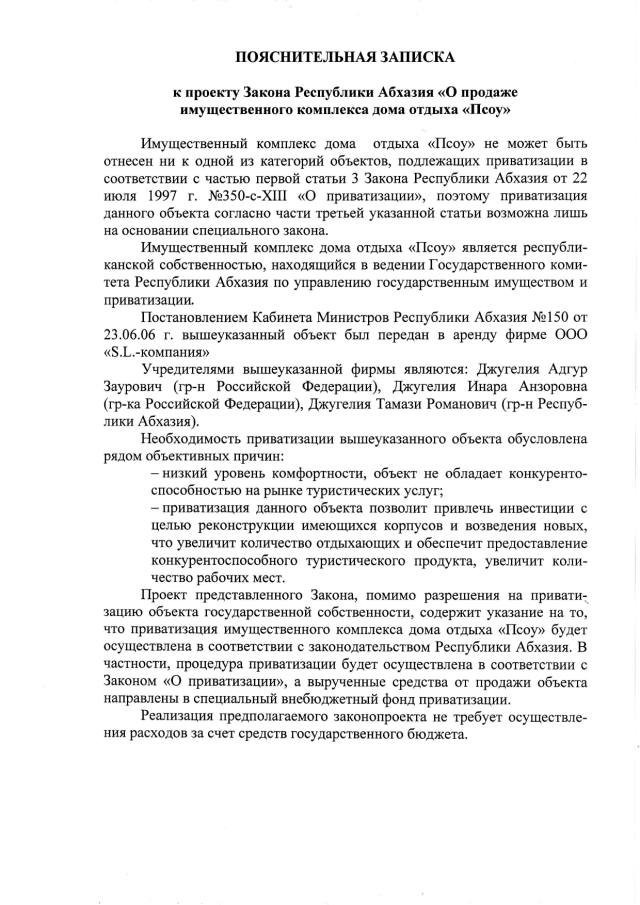 Постановление Кабинета Министров Республики Абхазия от 17.06.2015 № 68 "О продаже имущественного комплекса дома отдыха "Псоу"