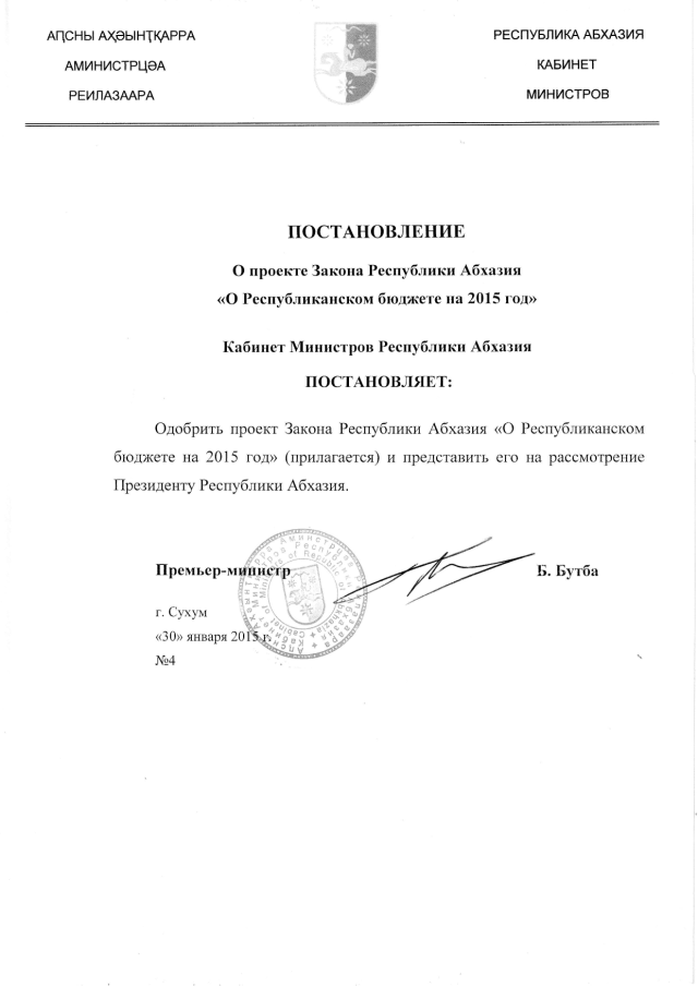 Постановление Кабинета Министров Республики Абхазия от 30.01.2015 № 4 "О проекте Закона Республики Абхазия "О Республиканском бюджете на 2015 год"