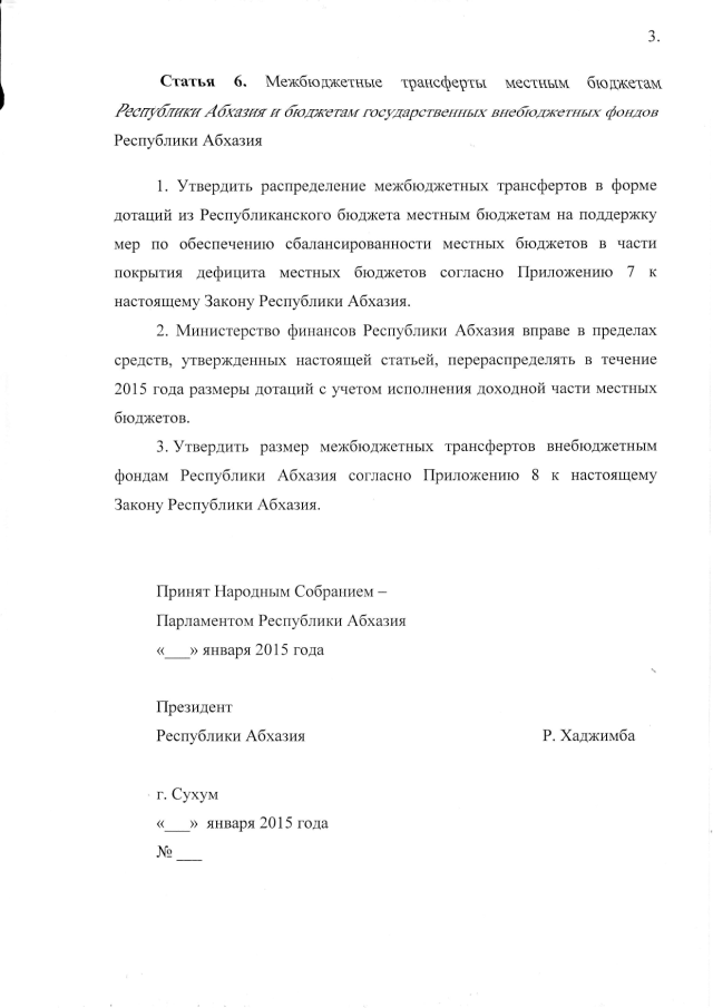 Постановление Кабинета Министров Республики Абхазия от 30.01.2015 № 4 "О проекте Закона Республики Абхазия "О Республиканском бюджете на 2015 год"