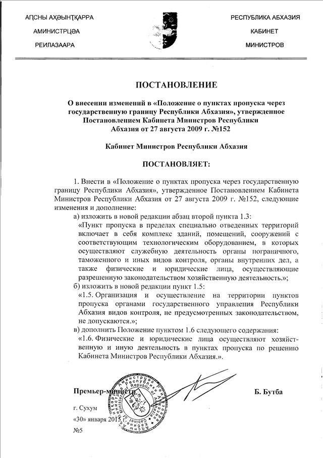 Постановление Кабинета Министров Республики Абхазия от 30.01.2015 № 5 "О внесении изменений в "Положение о пунктах пропуска через государственную границу Республики Абхазия", утвержденное Постановлением Кабинета Министров Республики Абхазия от 27 августа 2009 г. № 152"