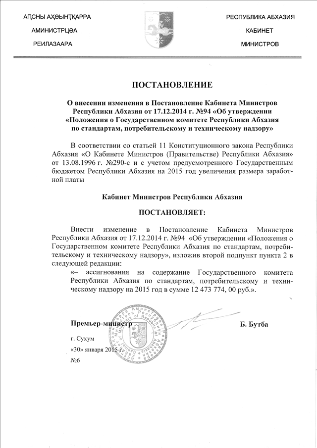 Постановление Кабинета Министров Республики Абхазия от 30.01.2015 № 6 "О внесении изменения в Постановление Кабинета Министров Республики Абхазия от 17.12.2014 г. № 94 "Об утверждении "Положения о Государственном комитете Республики Абхазия по стандартам, потребительскому и техническому надзору"