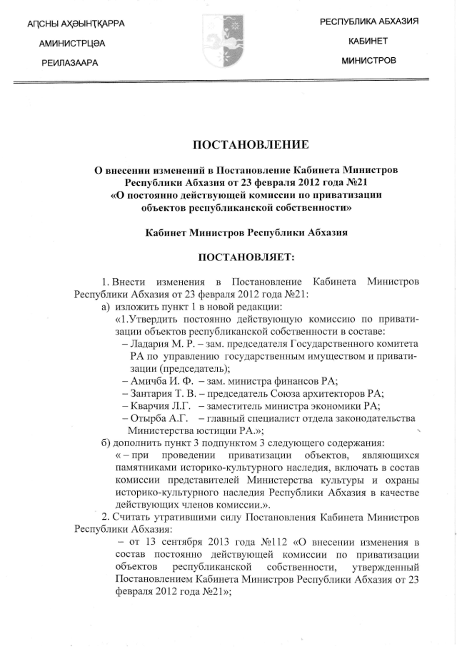 Постановление Кабинета Министров Республики Абхазия от 26.02.2015 № 21 "О внесении изменений в Постановление Кабинета Министров Республики Абхазия от 23 февраля 2012 года № 21 "О постоянно действующей комиссии по приватизации объектов республиканской собственности"