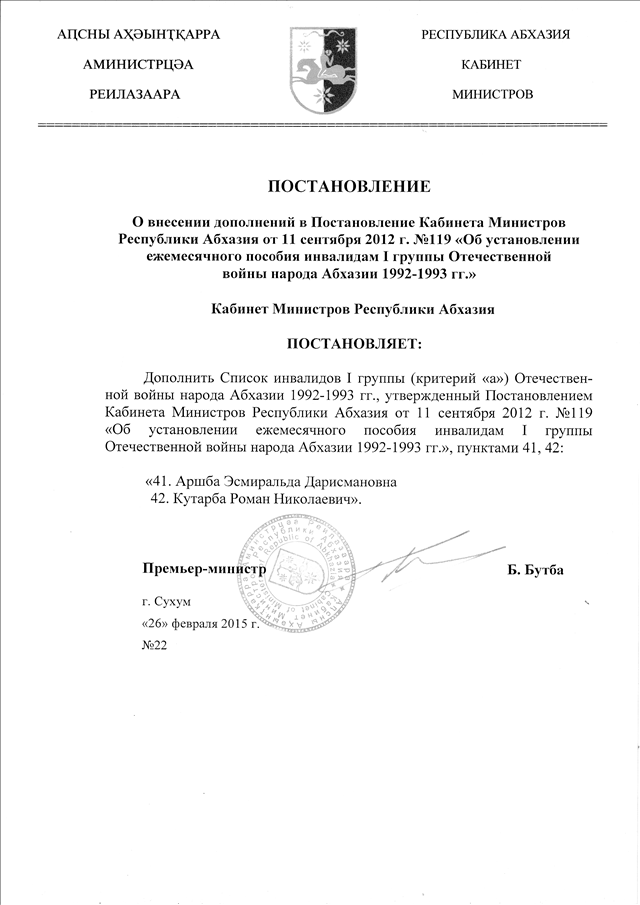 Постановление Кабинета Министров Республики Абхазия от 26.02.2015 № 22 "О внесении дополнений в Постановление Кабинета Министров Республики Абхазия от 11 сентября 2012 г. № 119 "Об установлении ежемесячного пособия инвалидам I группы Отечественной войны народа Абхазии 1992-1993 гг."