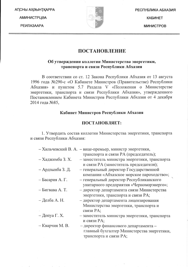 Постановление Кабинета Министров Республики Абхазия от 26.02.2015 № 23 "Об утверждении коллегии Министерства энергетики, транспорта и связи Республики Абхазия"
