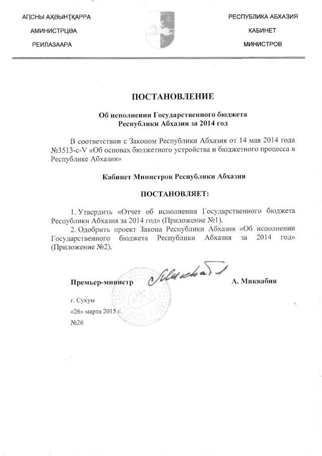 Постановление Кабинета Министров Республики Абхазия от 26.03.2015 № 26 "Об исполнении Государственного бюджета Республики Абхазия за 2014 год"