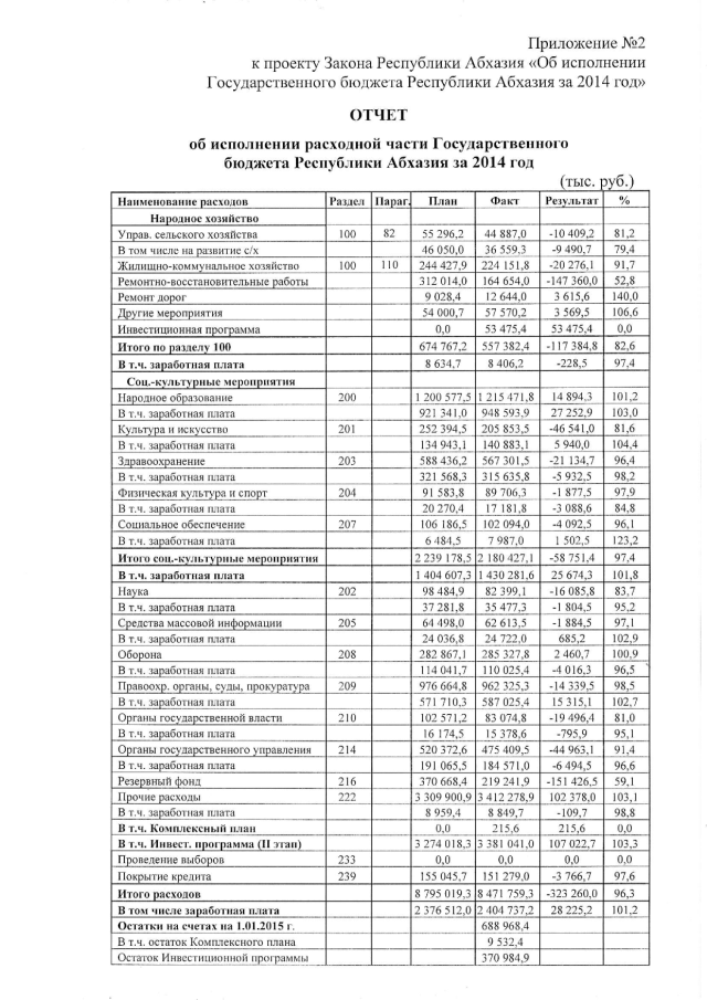 Постановление Кабинета Министров Республики Абхазия от 26.03.2015 № 26 "Об исполнении Государственного бюджета Республики Абхазия за 2014 год"