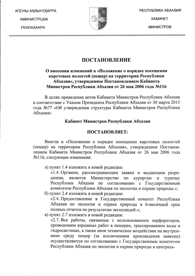 Постановление Кабинета Министров Республики Абхазия от 30.06.2015 № 70 "О внесении изменений в "Положение о порядке посещения карстовых полостей (пещер) на территории Республики Абхазия", утвержденное Постановлением Кабинета Министров Республики Абхазия от 26 мая 2006 года № 116"