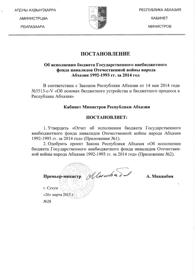 Постановление Кабинета Министров Республики Абхазия от 26.03.2015 № 28 "Об исполнении бюджета Государственного внебюджетного фонда инвалидов Отечественной войны народа Абхазии 1992-1993 гг. за 2014 год"