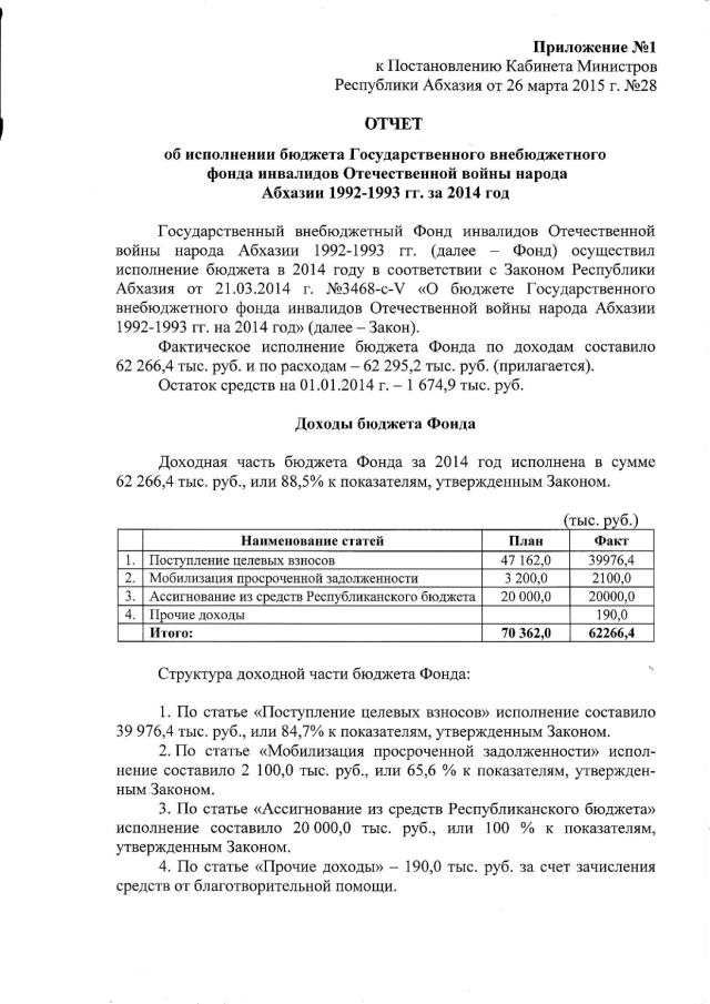 Постановление Кабинета Министров Республики Абхазия от 26.03.2015 № 28 "Об исполнении бюджета Государственного внебюджетного фонда инвалидов Отечественной войны народа Абхазии 1992-1993 гг. за 2014 год"