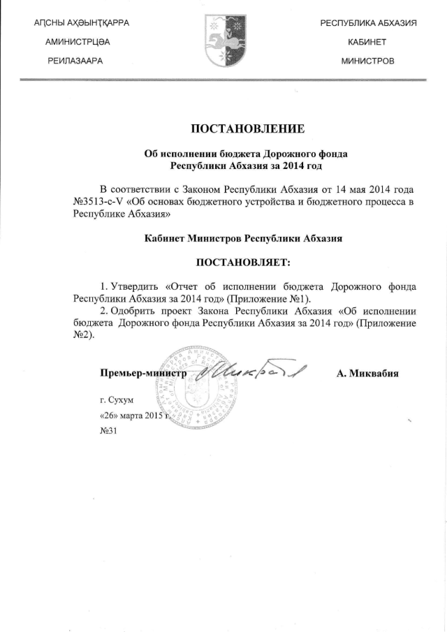 Постановление Кабинета Министров Республики Абхазия от 26.03.2015 № 31 "Об исполнении бюджета Дорожного фонда Республики Абхазия за 2014 год"