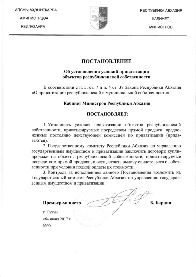 Постановление Кабинета Министров Республики Абхазия от 06.06.2017 № 90 "Об установлении условий приватизации объектов республиканской собственности"