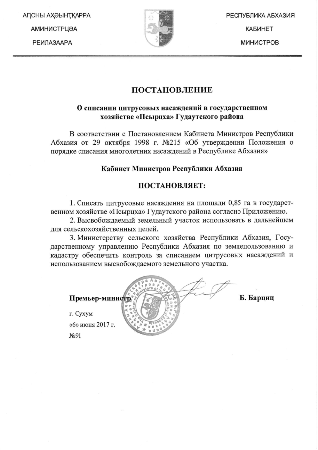Постановление Кабинета Министров Республики Абхазия от 06.06.2017 № 91 "О списании цитрусовых насаждений в государственном хозяйстве "Псырцха" Гудаутского района"