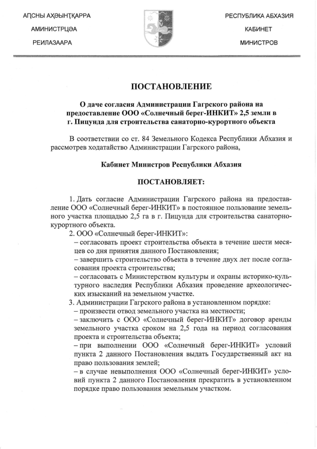 Постановление Кабинета Министров Республики Абхазия от 06.06.2017 № 93 "О даче согласия Администрации Гагрского района на предоставление ООО "Солнечный берег-ИНКИТ" 2,5 земли в г. Пицунда для строительства санаторно-курортного объекта"