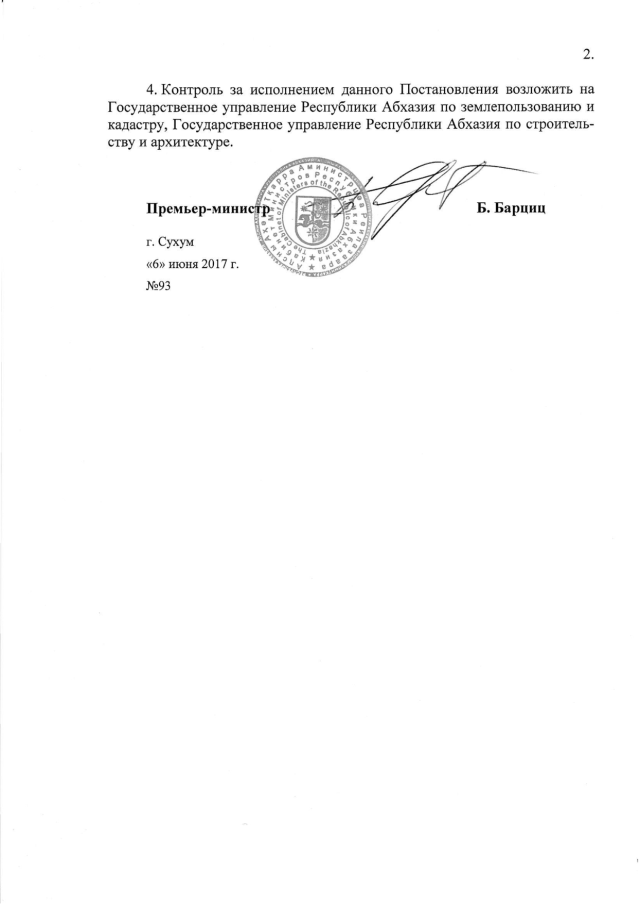 Постановление Кабинета Министров Республики Абхазия от 06.06.2017 № 93 "О даче согласия Администрации Гагрского района на предоставление ООО "Солнечный берег-ИНКИТ" 2,5 земли в г. Пицунда для строительства санаторно-курортного объекта"