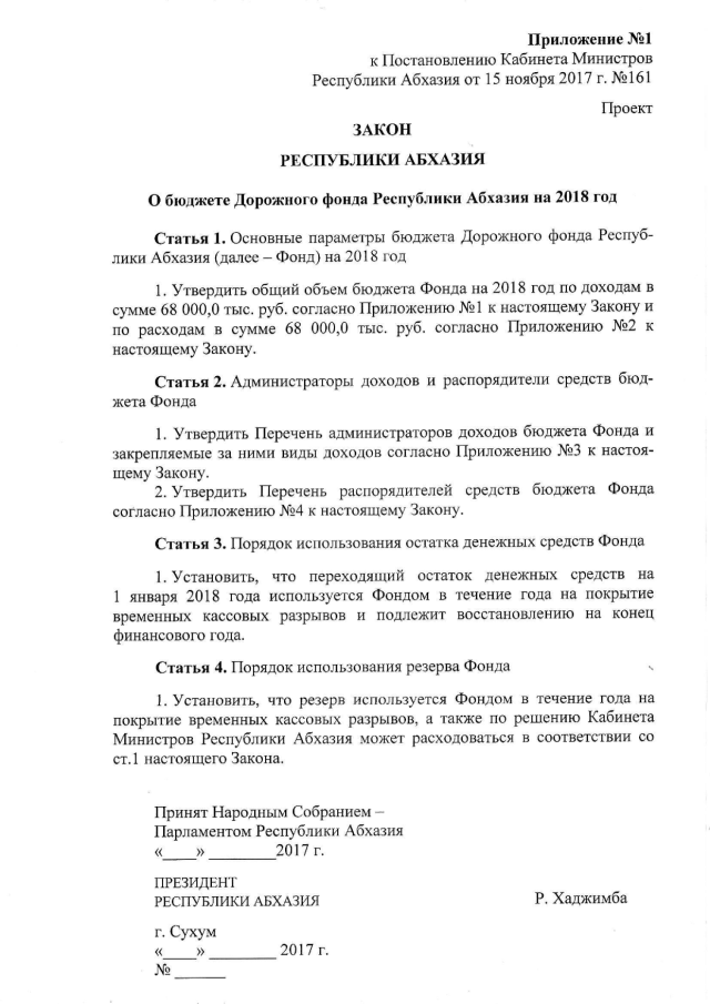Постановление Кабинета Министров Республики Абхазия от 15.11.2017 № 161 "О проекте Закона Республики Абхазия "О бюджете Дорожного фонда Республики Абхазия на 2018 год", утверждении штатного расписания и сметы расходов аппарата управления Дорожного фонда Республики Абхазия на 2018 год"