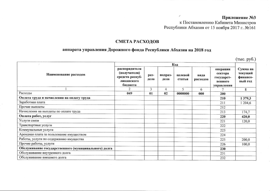 Постановление Кабинета Министров Республики Абхазия от 15.11.2017 № 161 "О проекте Закона Республики Абхазия "О бюджете Дорожного фонда Республики Абхазия на 2018 год", утверждении штатного расписания и сметы расходов аппарата управления Дорожного фонда Республики Абхазия на 2018 год"