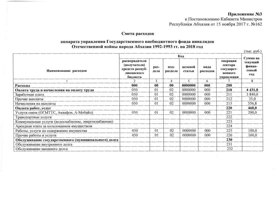 Постановление Кабинета Министров Республики Абхазия от 15.11.2017 № 162 "О проекте Закона Республики Абхазия "О бюджете Государственного внебюджетного фонда инвалидов Отечественной войны народа Абхазии 1992-1993 гг. на 2018 год", утверждении штатного расписания и сметы расходов аппарата управления Государственного внебюджетного фонда инвалидов Отечественной войны народа Абхазии 1992-1993 гг. на 2018 год"