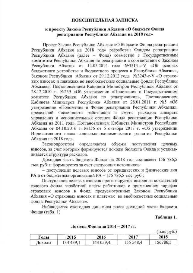 Постановление Кабинета Министров Республики Абхазия от 15.11.2017 № 163 "О проекте Закона Республики Абхазия "О бюджете Фонда репатриации Республики Абхазия на 2018 год", утверждении штатного расписания и сметы расходов аппарата управления и исполнительных органов Фонда репатриации Республики Абхазия на 2018 год"