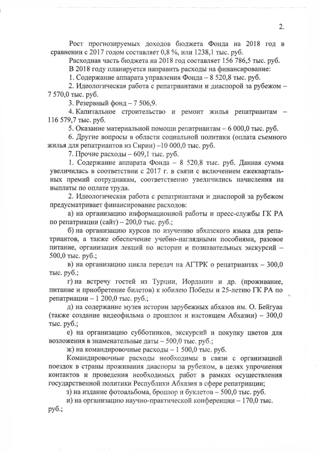Постановление Кабинета Министров Республики Абхазия от 15.11.2017 № 163 "О проекте Закона Республики Абхазия "О бюджете Фонда репатриации Республики Абхазия на 2018 год", утверждении штатного расписания и сметы расходов аппарата управления и исполнительных органов Фонда репатриации Республики Абхазия на 2018 год"