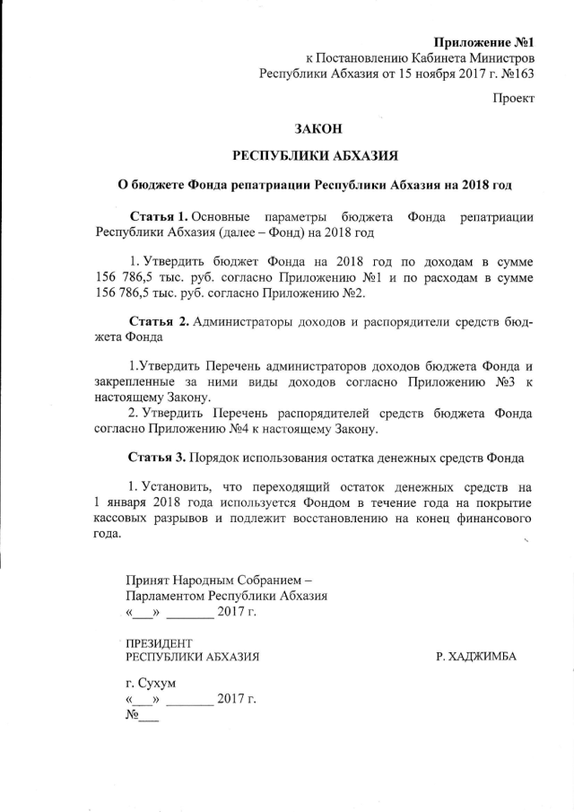 Постановление Кабинета Министров Республики Абхазия от 15.11.2017 № 163 "О проекте Закона Республики Абхазия "О бюджете Фонда репатриации Республики Абхазия на 2018 год", утверждении штатного расписания и сметы расходов аппарата управления и исполнительных органов Фонда репатриации Республики Абхазия на 2018 год"