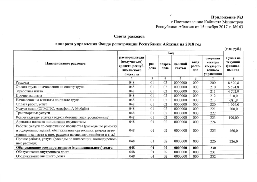 Постановление Кабинета Министров Республики Абхазия от 15.11.2017 № 163 "О проекте Закона Республики Абхазия "О бюджете Фонда репатриации Республики Абхазия на 2018 год", утверждении штатного расписания и сметы расходов аппарата управления и исполнительных органов Фонда репатриации Республики Абхазия на 2018 год"
