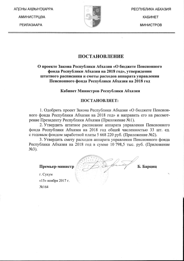 Постановление Кабинета Министров Республики Абхазия от 15.11.2017 № 164 "О проекте Закона Республики Абхазия "О бюджете Пенсионного фонда Республики Абхазия на 2018 год", утверждении штатного расписания и сметы расходов аппарата управления Пенсионного фонда Республики Абхазия на 2018 год"