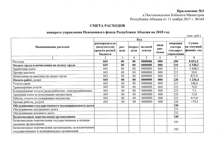 Постановление Кабинета Министров Республики Абхазия от 15.11.2017 № 164 "О проекте Закона Республики Абхазия "О бюджете Пенсионного фонда Республики Абхазия на 2018 год", утверждении штатного расписания и сметы расходов аппарата управления Пенсионного фонда Республики Абхазия на 2018 год"
