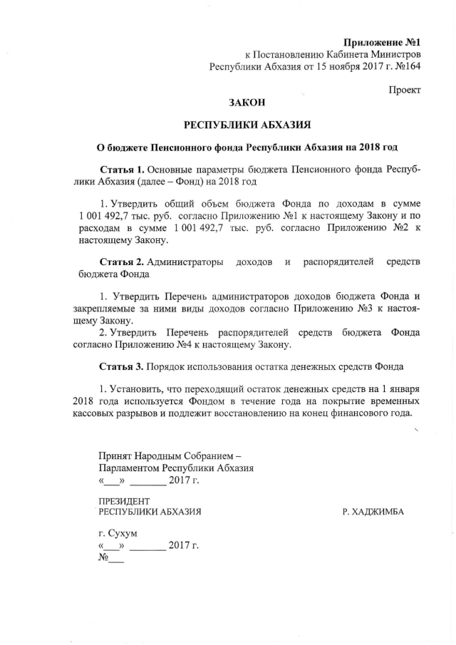 Постановление Кабинета Министров Республики Абхазия от 15.11.2017 № 164 "О проекте Закона Республики Абхазия "О бюджете Пенсионного фонда Республики Абхазия на 2018 год", утверждении штатного расписания и сметы расходов аппарата управления Пенсионного фонда Республики Абхазия на 2018 год"