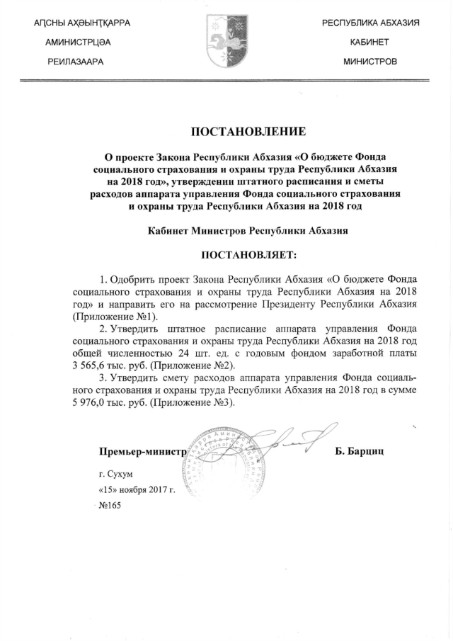 Постановление Кабинета Министров Республики Абхазия от 15.11.2017 № 165 "О проекте Закона Республики Абхазия "О бюджете Фонда социального страхования и охраны труда Республики Абхазия на 2018 год", утверждении штатного расписания и сметы расходов аппарата управления Фонда социального страхования и охраны труда Республики Абхазия на 2018 год"