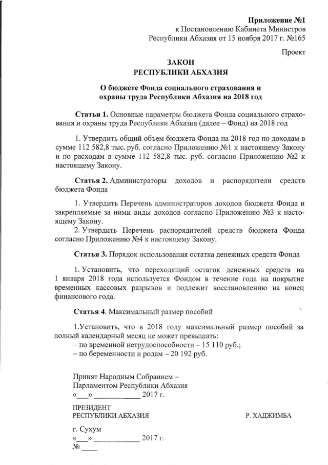 Постановление Кабинета Министров Республики Абхазия от 15.11.2017 № 165 "О проекте Закона Республики Абхазия "О бюджете Фонда социального страхования и охраны труда Республики Абхазия на 2018 год", утверждении штатного расписания и сметы расходов аппарата управления Фонда социального страхования и охраны труда Республики Абхазия на 2018 год"