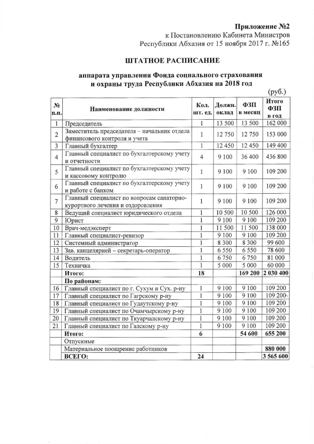 Постановление Кабинета Министров Республики Абхазия от 15.11.2017 № 165 "О проекте Закона Республики Абхазия "О бюджете Фонда социального страхования и охраны труда Республики Абхазия на 2018 год", утверждении штатного расписания и сметы расходов аппарата управления Фонда социального страхования и охраны труда Республики Абхазия на 2018 год"