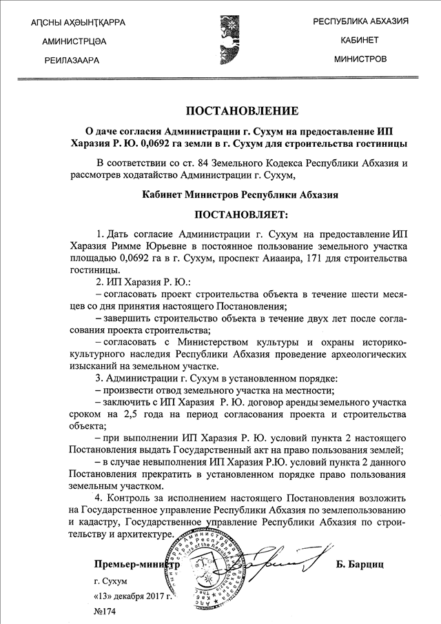 Постановление Кабинета Министров Республики Абхазия от 13.12.2017 № 174 "О даче согласия Администрации г. Сухум на предоставление ИП Харазия Р.Ю. 0,0692 га земли в г. Сухум для строительства гостиницы"