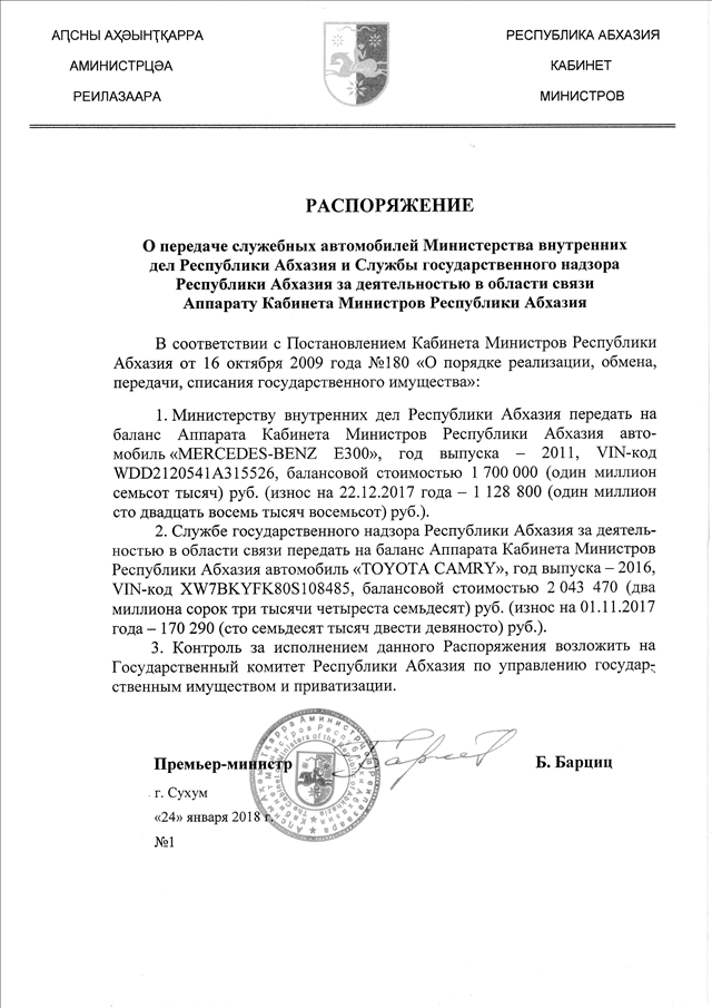 Распоряжение Кабинета Министров Республики Абхазия от 24.01.2018 № 1 "О передаче служебных автомобилей Министерства внутренних дел Республики Абхазия и Службы государственного надзора Республики Абхазия за деятельностью в области связи Аппарату Кабинета Министров Республики Абхазия"