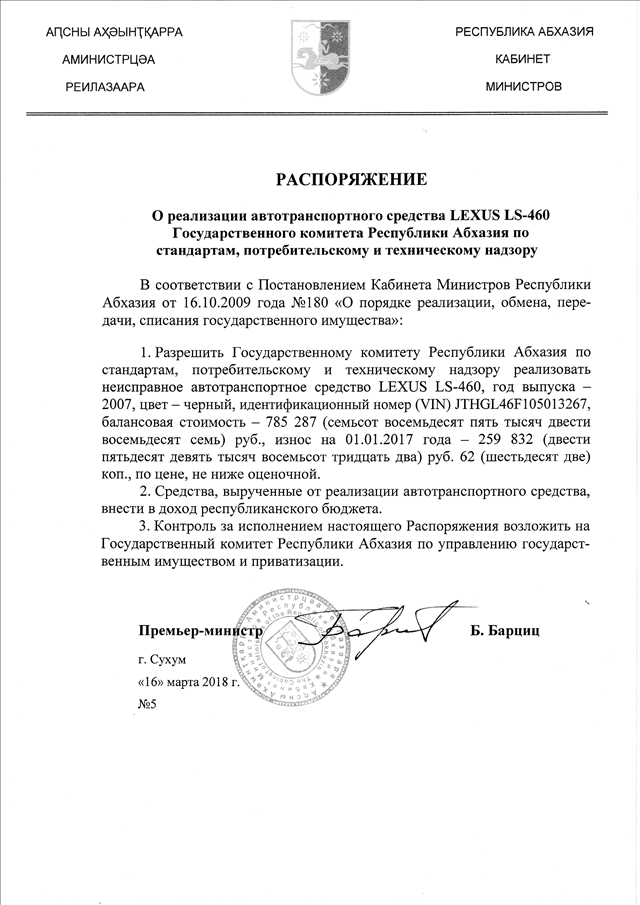 Распоряжение Кабинета Министров Республики Абхазия от 16.03.2018 № 5 "О реализации автотранспортного средства LEXUS LS-460 Государственного комитета Республики Абхазия по стандартам, потребительскому и техническому надзору"