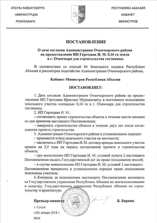 Постановление Кабинета Министров Республики Абхазия от 30.01.2018 № 10 "О даче согласия Администрации Очамчырского района на предоставление ИП Гергедава И.М. 0,16 га земли в г. Очамчыра для строительства гостиницы"