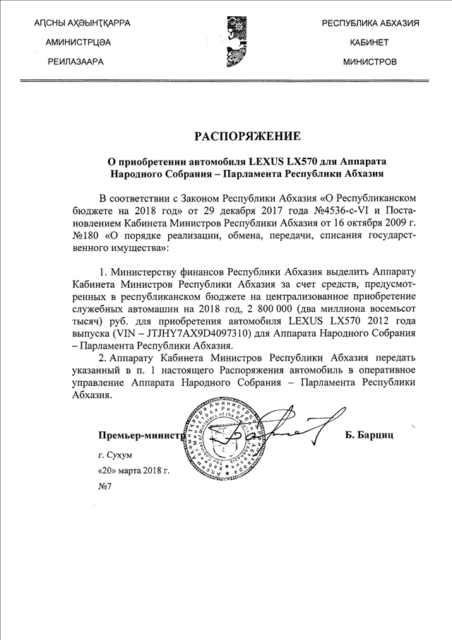 Распоряжение Кабинета Министров Республики Абхазия от 20.03.2018 № 7 "О приобретении автомобиля LEXUS LX570 для Аппарата Народного Собрания-Парламента Республики Абхазия"