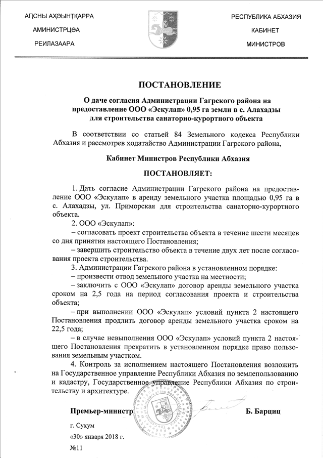 Постановление Кабинета Министров Республики Абхазия от 30.01.2018 № 11 "О даче согласия Администрации Гагрского района на предоставление ООО "Эскулап" 0,95 га земли в с. Алахадзы для строительства санаторно-курортного объекта"