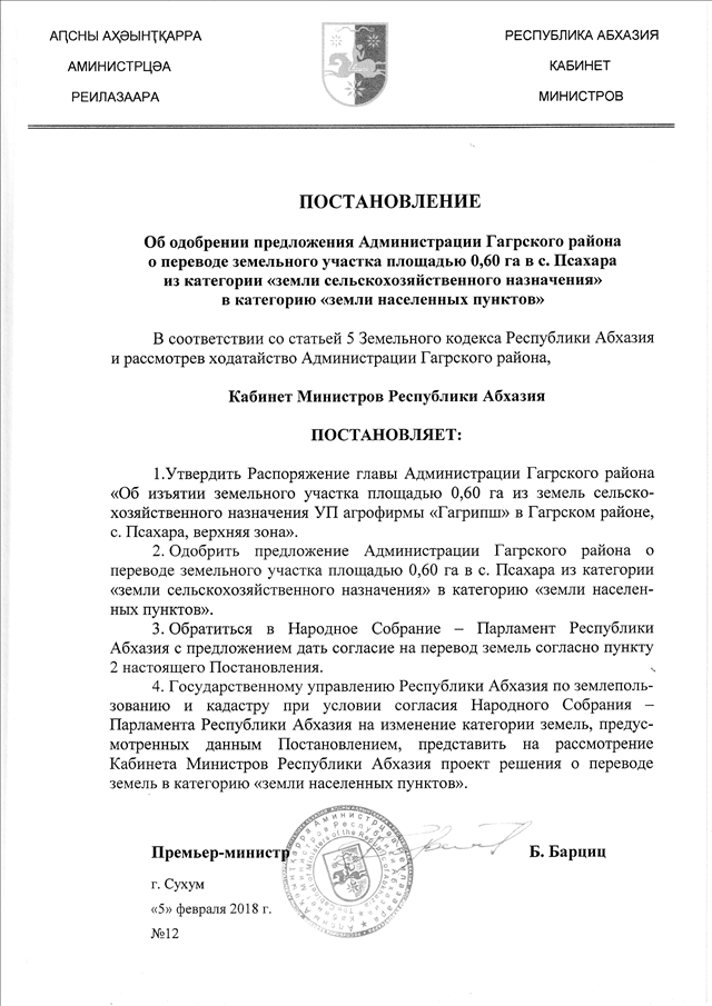 Постановление Кабинета Министров Республики Абхазия от 05.02.2018 № 12 "Об одобрении предложения Администрации Гагрского района о переводе земельного участка площадью 0,60 га в с. Псахара из категории "земли сельскохозяйственного назначения" в категорию "земли населенных пунктов"