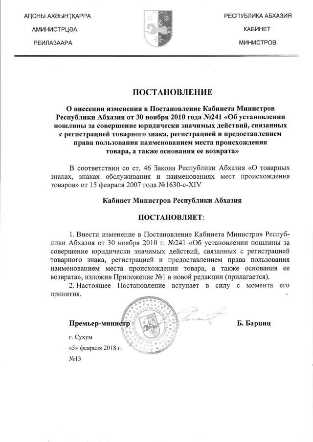 Постановление Кабинета Министров Республики Абхазия от 05.02.2018 № 13 "О внесении изменения в Постановление Кабинета Министров Республики Абхазия от 30 ноября 2010 года № 241 "Об установлении пошлины за совершение юридически значимых действий, связанных с регистрацией товарного знака, регистрацией и предоставлением права пользования наименованием места происхождения товара, а также основания ее возврата"
