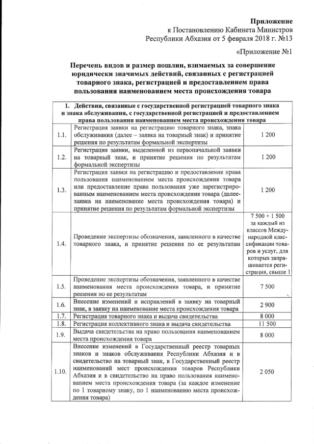 Постановление Кабинета Министров Республики Абхазия от 05.02.2018 № 13 "О внесении изменения в Постановление Кабинета Министров Республики Абхазия от 30 ноября 2010 года № 241 "Об установлении пошлины за совершение юридически значимых действий, связанных с регистрацией товарного знака, регистрацией и предоставлением права пользования наименованием места происхождения товара, а также основания ее возврата"