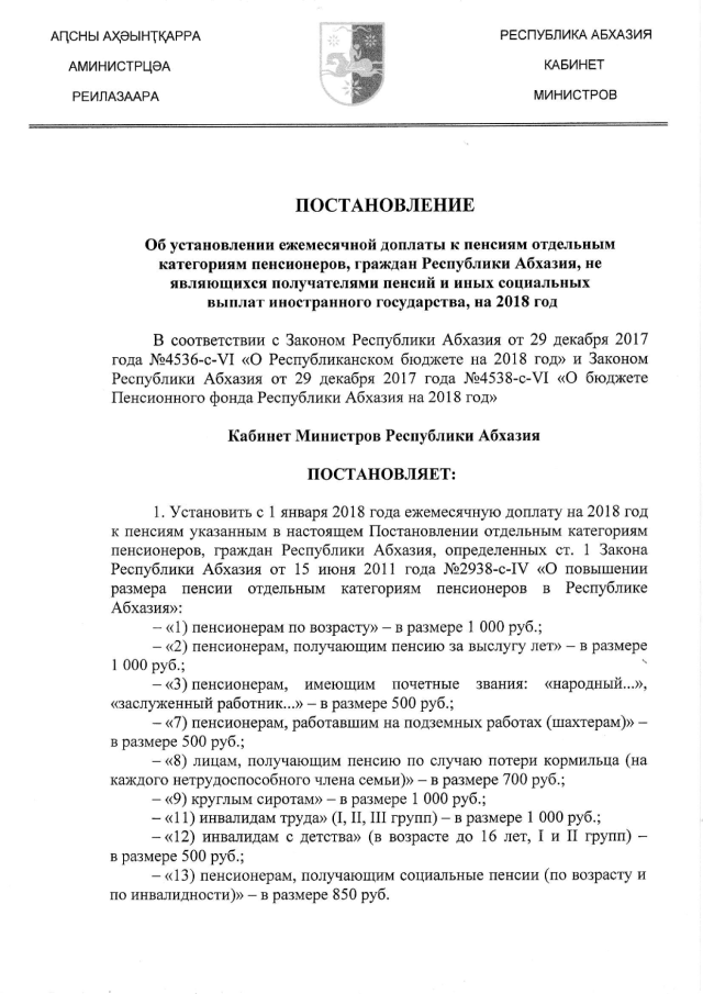 Постановление Кабинета Министров Республики Абхазия от 07.02.2018 № 16 "Об установлении ежемесячной доплаты к пенсиям отдельным категориям пенсионеров, граждан Республики Абхазия, не являющихся получателями пенсий и иных социальных выплат иностранного государства, на 2018 год"