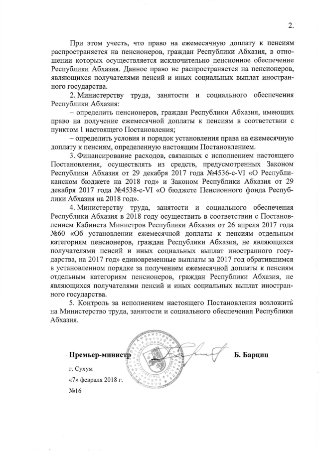 Постановление Кабинета Министров Республики Абхазия от 07.02.2018 № 16 "Об установлении ежемесячной доплаты к пенсиям отдельным категориям пенсионеров, граждан Республики Абхазия, не являющихся получателями пенсий и иных социальных выплат иностранного государства, на 2018 год"