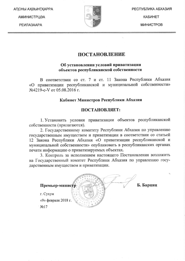 Постановление Кабинета Министров Республики Абхазия от 09.02.2018 № 17 "Об установлении условий приватизации объектов республиканской собственности"