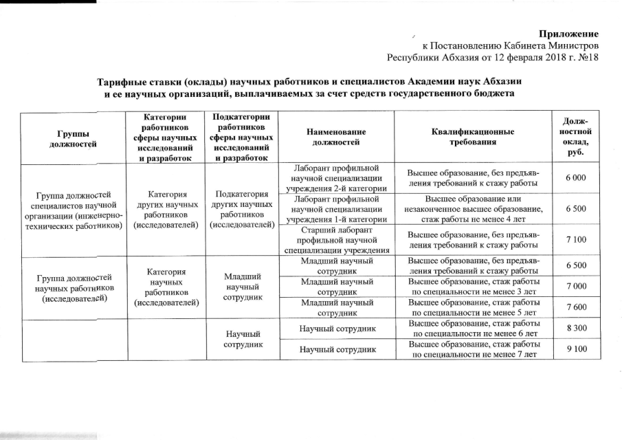 Постановление Кабинета Министров Республики Абхазия от 12.02.2018 № 18 "О тарифных ставках (окладах) научных работников и специалистов Академии наук Абхазии и ее научных организаций"
