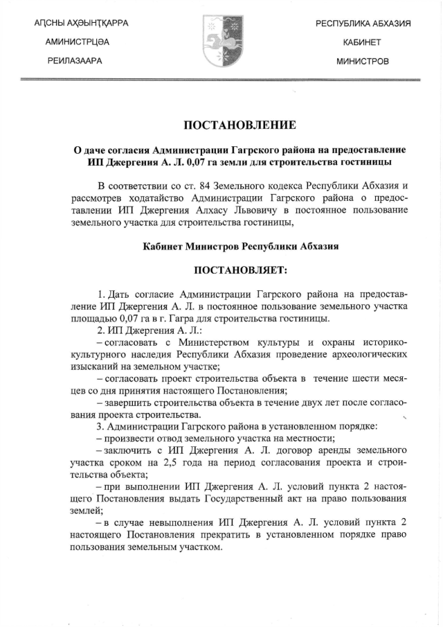 Постановление Кабинета Министров Республики Абхазия от 21.02.2018 № 19 "О даче согласия Администрации Гагрского района на предоставление ИП Джергения А.Л. 0,07 га земли для строительства гостиницы"
