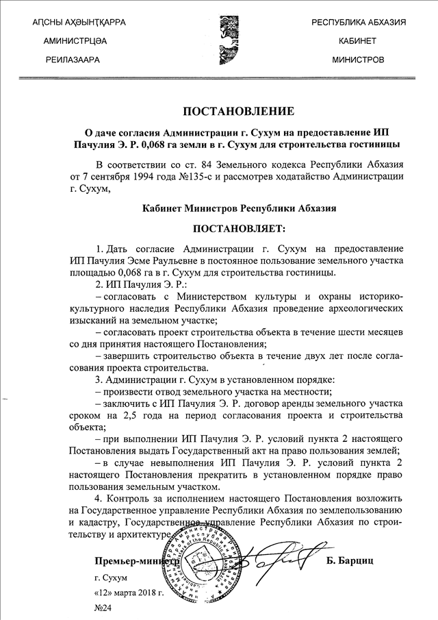 Постановление Кабинета Министров Республики Абхазия от 12.03.2018 № 24 "О даче согласия Администрации г. Сухум на предоставление ИП Пачулия Э.Р. 0,068 га земли в г. Сухум для строительства гостиницы"
